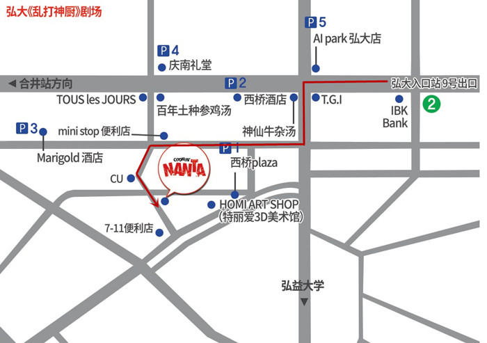 地铁2号线弘大口(홍대입구)站9号出口出来,步行约9分钟即可。