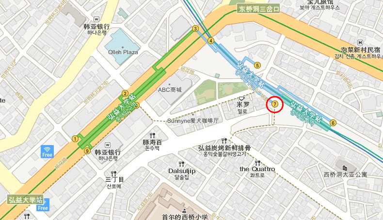 首尔特别市麻浦区杨花路188 地铁机场铁路线 弘大入口站 7号出口 B2